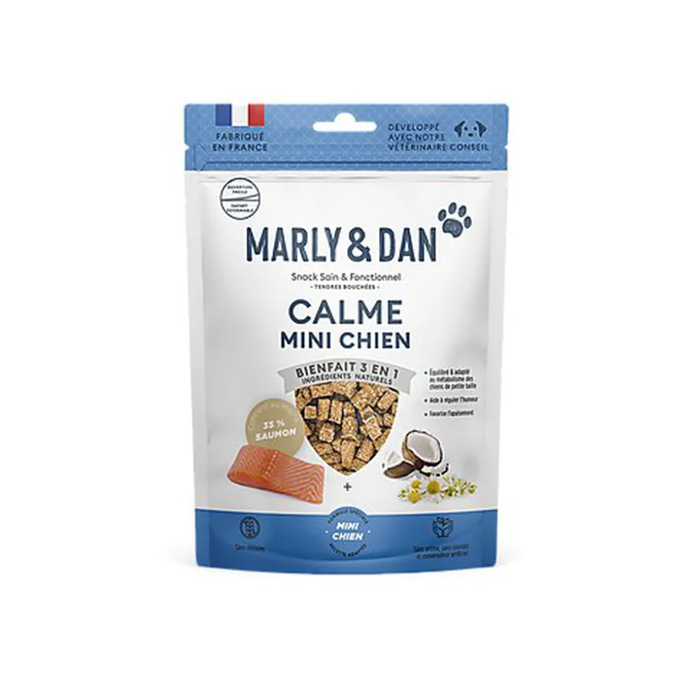 » Adapté à la mâchoire des petits chiens, ce snack naturel contient de la camomille aux effets apaisants et du L-tryptophane, acide aminé favorisant la production de sérotonine. Cette recette favorise un comportement positif de votre compagnon. »