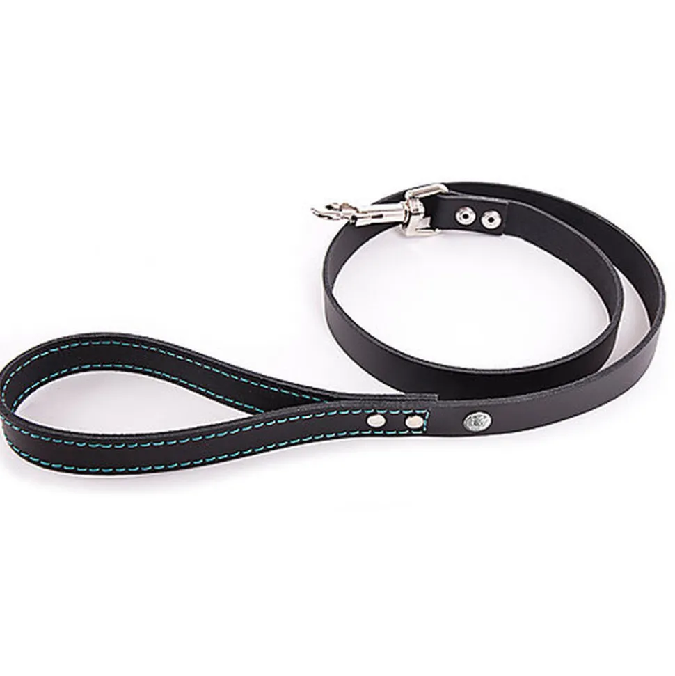 Laisse Flash pour chien, en cuir classique, un cuir un peu brut, qui est relevé et modernisé par une couture en fil épais et fluo autour de l apoignée.