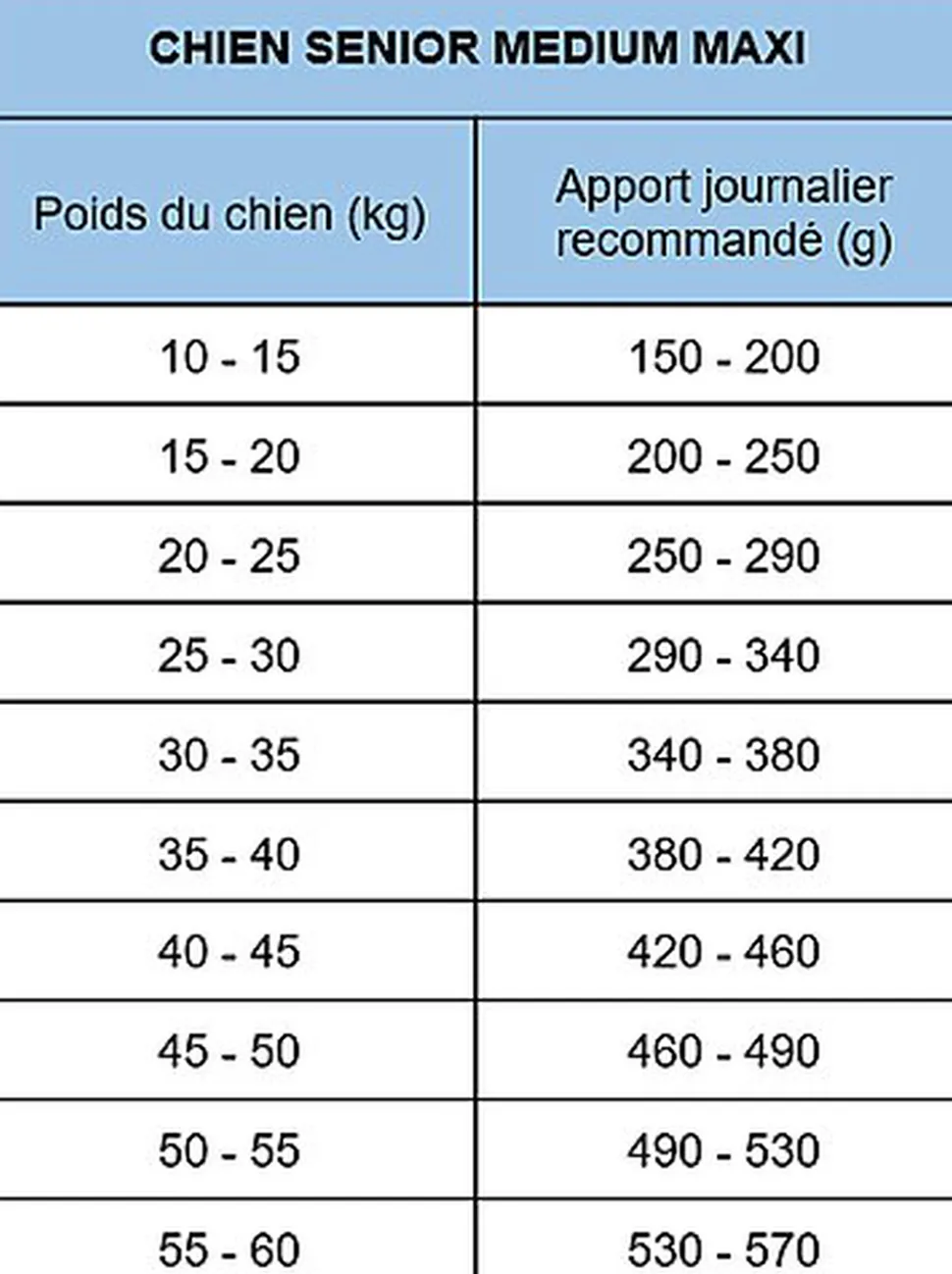 | Directives d’alimentation | La quantité quotidienne peut varier en fonction de la température extérieure, du mode de vie de l’animal (à l’intérieur ou à l’extérieur), du tempérament et de l’activité. Il est recommandé d’effectuer le changement d’un aliment à d’autres aliments de manière progressive pendant une période minimale d’une semaine. Assurez-vous que votre animal ait un accès permanent à de l’eau fraîche. Stockez dans un endroit frais et sec et fermez correctement le contenant après chaque utilisation. La taille et la couleur du produit peuvent varier en fonction des propriétés et caractéristiques des ingrédients. Poids du chien (kg) | Quantité quotidienne recommandée (g) 10 – 15 | 150 – 200 15 – 20 | 200 – 250 20 – 25 | 250 – 290 25 – 30 | 290 – 340 30 – 35 | 340 – 380 35 – 40 | 380 – 420 40 – 45 | 420 – 460 45 – 50 | 460 – 490 50 – 55 | 490 – 530 55 – 60 | 530 – 571 |