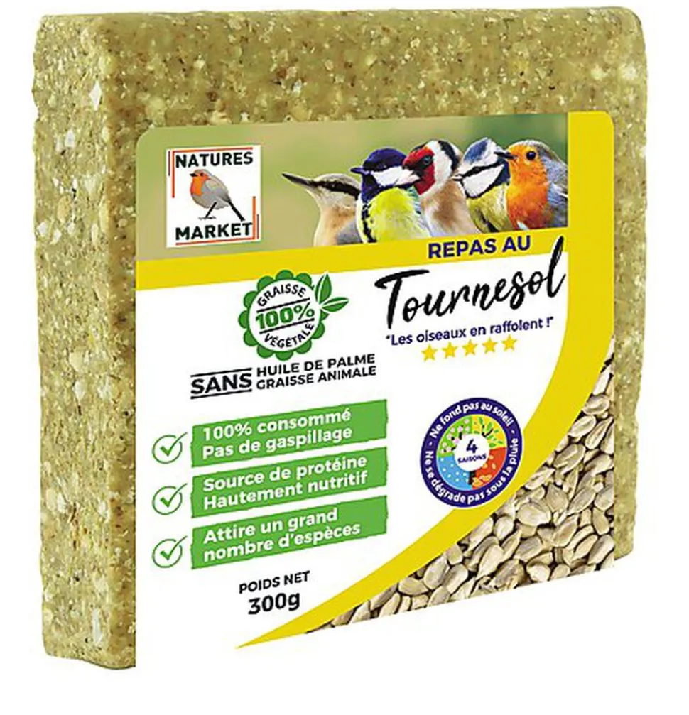 Bloc de 300 gr de graisse végétale sans huile de palme aux tournesols, les oiseaux picorent sur place au lieu d’emmener la nourriture au loin , ce qui permet de les observer plus longtemps.