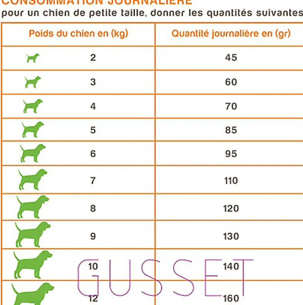 | Composition | Composition: poulet frais (30 %), protéine de poulet (25 %), pois, graisse de volaille (10 %), pommes de terre, protéine de pois, foie de poulet hydrolysé (2 %), huile de saumon (2 %), graines de lin (2 %), pulpe de pomme déshydratée, levures, carottes, varech (Ascophyllum nodosum, 0,5 %), carbonate de calcium, romarin déshydraté (0,05 %), graines de chardon (0,05 %), cynorrhodons déshydratés (0,05 %), argousier déshydraté (0,05 %), mannaneoligosaccharides (0,015 %), fructo-oligosaccharides (0,012 %), yucca schidigera (0,01 %), Lactobacillus acidophilus HA-122 inactivé (15×10 9 cellules/kg). |