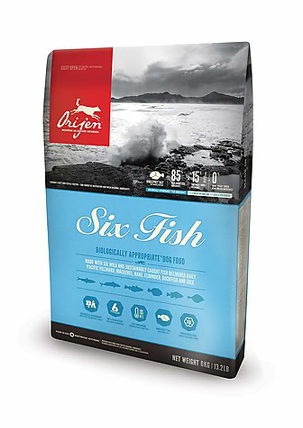 ORIJEN SIX FISH, avec 38 % de protéines nourrissantes et seulement 18 % de glucides à faible indice glycémique, nourrit les chiens de tous les âges en fonction de leurs besoins biologiques.