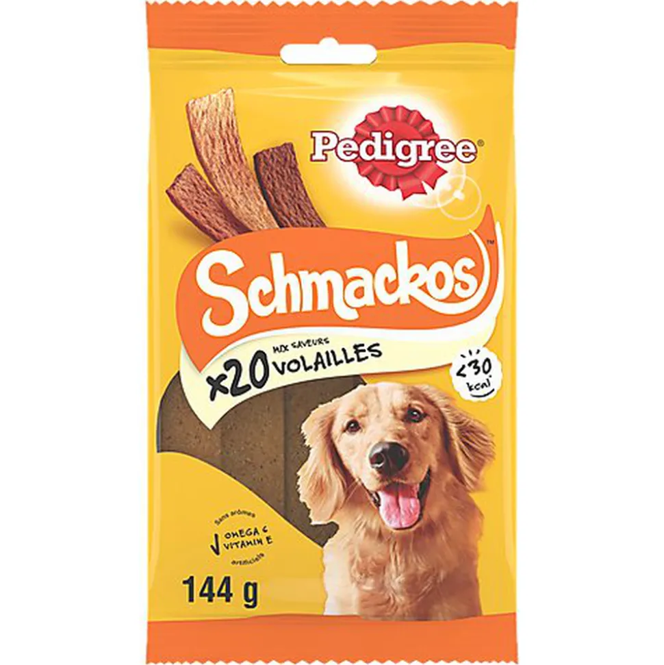 Aliment complémentaire pour chiens adultes – Mix Saveurs Volailles (Poulet/Dinde/Canard). Les friandises Pedigree ® Schmackos™ sont une excellente façon de récompenser votre chien ou simplement de lui montrer combien vous l’aimez. Délicieuses et tendres récompenses sans arômes artificiels et pleines de saveurs dont les chiens raffolent à moins de 30 calories par récompense. Avec des omega 6 pour l’aider à rester en forme tout au long de sa vie, des vitamines E pour l’aider à préserver ses défenses naturelles et des minéraux, dont du calcium, pour l’aider à garder des os solides. Languette refermable : détachez-la et utilisez-la pour refermer votre sachet une fois ouvert ; parfait pour la conservation.