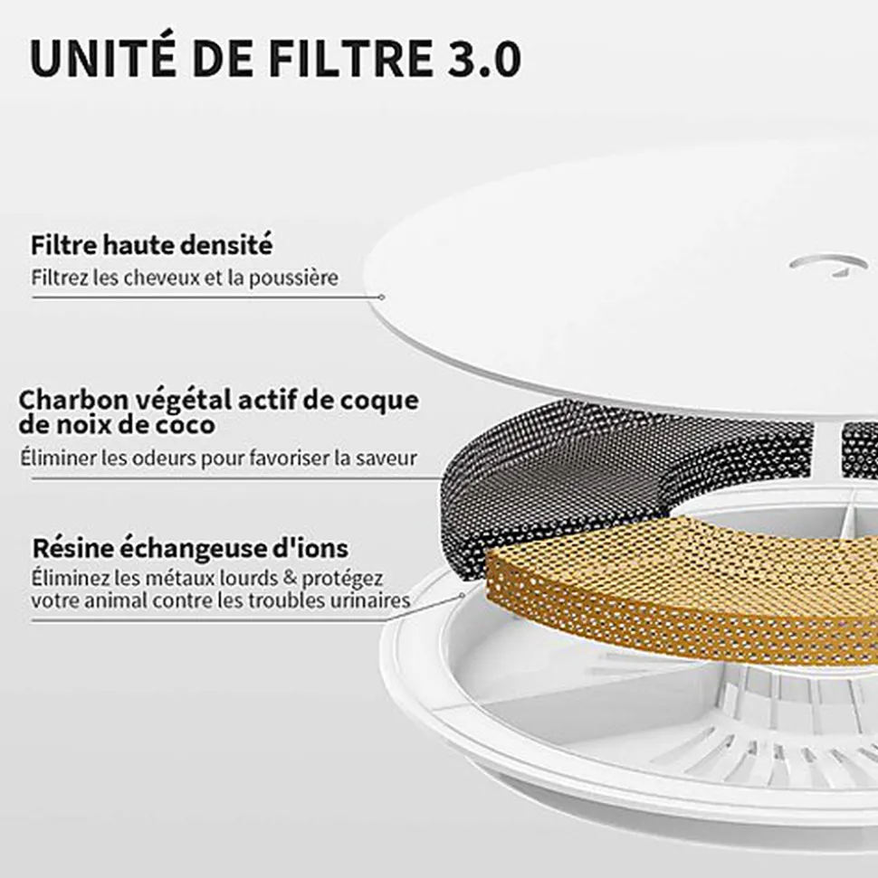 Filtration : L’eau est filtrée en continue grâce à un filtre haute performance composé de couches supérieures et inférieures de coton, de charbon actif en coquille de noix de coco et de résine échangeuse d’ions. Ce qui permet de fournir une eau saine et riche en oxygène à votre animal.