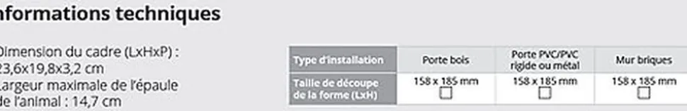 Les portes à trappe permettent aux animaux d’accéder au monde extérieur et de bénéficier ainsi de plus de liberté. Le verrouillage à 2 positions permet de gérer sans contrainte les allers et venues de l’animal : en position ouverte, l’animal à accès à l’extérieur et peut retourner dans le domicile ; en position fermée, l’accès est totalement bloqué. Le plastique est solide, résistant aux chocs et durable, capable de résister aux animaux de compagnie les plus énergiques. Cette porte peut être installée sur la plupart des portes ou des murs, quels que soient leurs types (bois, PVC, brique, métal) mais ne convient pas aux surfaces vitrées.