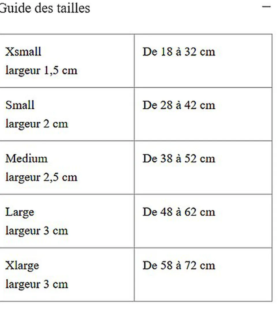 Bien que les colliers soient réglables, consultez le guide des tailles pour choisir au mieux la taille qui conviendra à votre chien. Ce produit est fabriqué à la main, il est donc possible que celui ci diffère légèrement de la photo.
