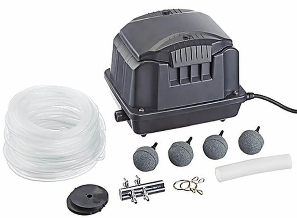 Pontec PondoAir Set 1800 est une pompe d’aération en kit complet pour enrichir de manière fiable l’eau du bassin en oxygène. Le kit convient pour un emploi à l’extérieur et inclut une pompe d’aération silencieuse d’une puissance de 1 800 l/h, un diffuseur d’air, 4 flexibles d’air de 5 m et 4 pierres de diffusion et membranes de rechange.