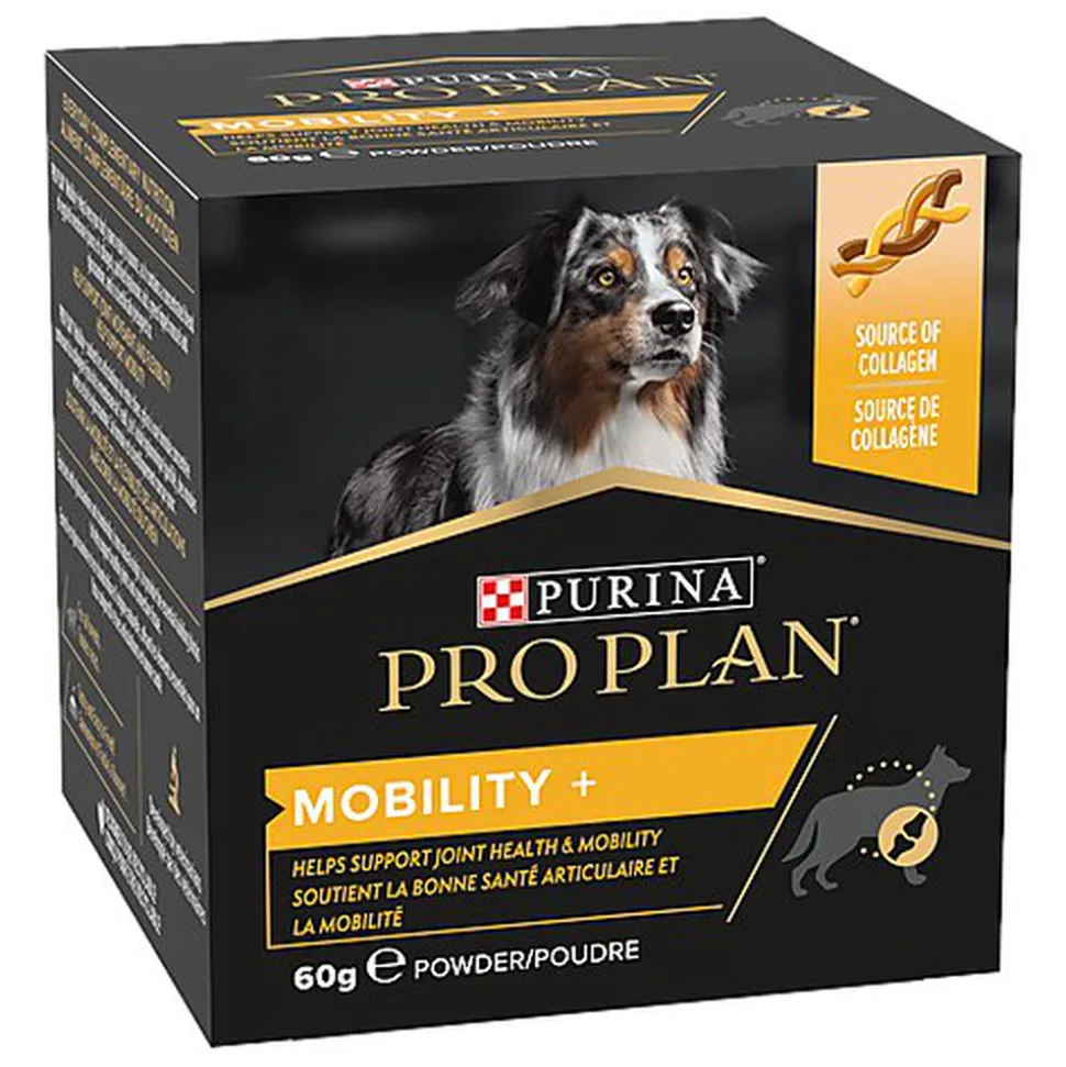 PRO PLAN Mobility+ soutient les articulations de votre chien, grâce à une formule concentrée contenant du collagène (issu de la membrane de l’½uf), de l’acide hyaluronique (purifié), des moules vertes et de la glucosamine.