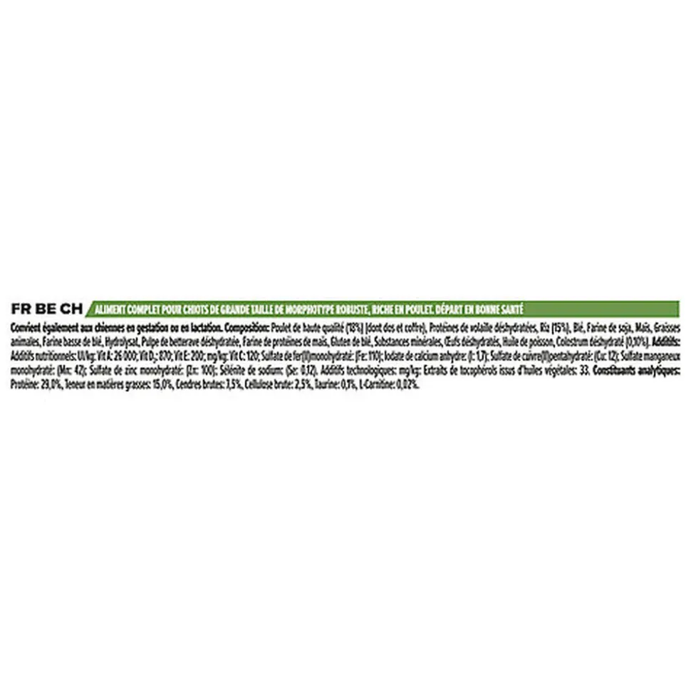 | Composition | Poulet (17%), blé, protéines de volaille déshydratées, maïs, riz (6%), farine de soja, graisse animale, fibre de blé, gluten, hydrolysat, pulpe de betterave déshydratée, sels minéraux, huile de poisson, colostrum déshydraté (0,1%) |