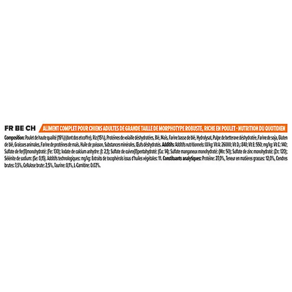 | Composition | Protéines de volaille déshydratées, blé, maïs, poulet (14%), gruau de maïs, farine de soja, riz (4%), fibre de blé, hydrolysat, graisse animale, pulpe de betterave déshydratée, gluten, sels minéraux, huile de poisson |