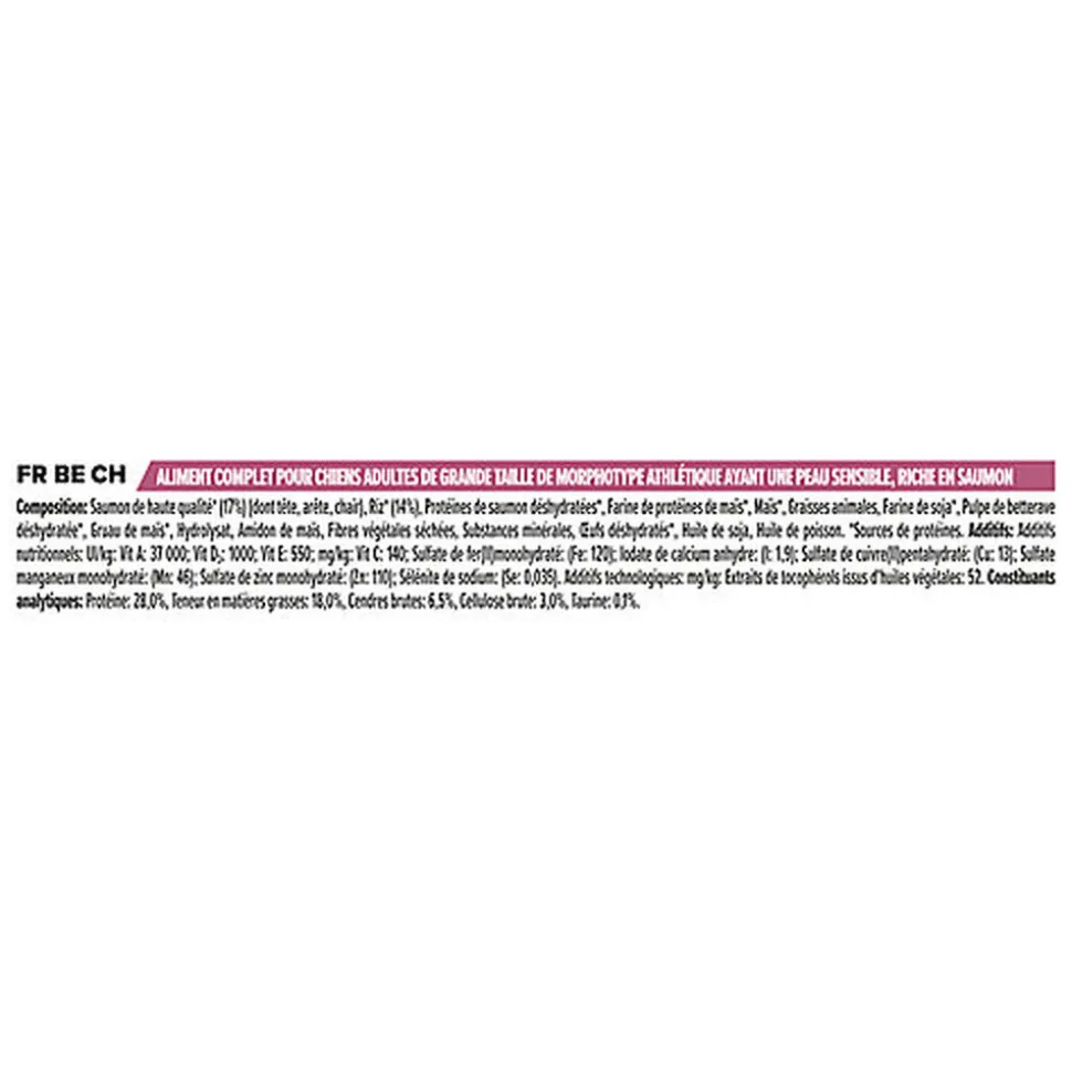Les croquettes sont spécialement formulées sans gluten de blé* auquel certains chiens sont allergiques. Elles contiennent un mélange spécifique de nutriments sélectionnés pour leur action sur la sensibilité cutanée. Spécialement formulée par nos vétérinaires et experts nutritionnels notre formule contient des ingrédients tels que : du saumon, de la pulpe de betterave déshydratée, de l’oeuf déshydraté pour aider à réduire un possible inconfort cutané chez le chien sensible.