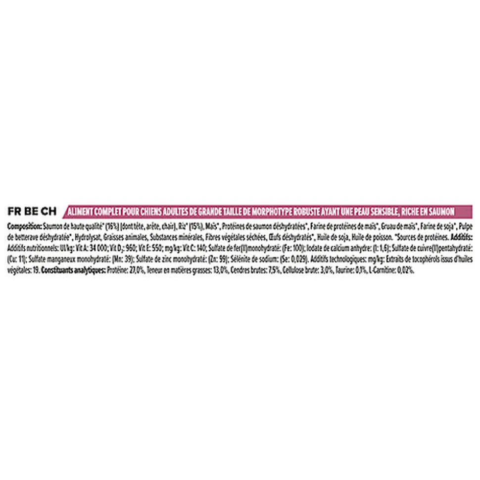 | Composition | Saumon* (16%), riz* (14%), maïs*, protéines de saumon déshydratées*, gluten de maïs*, gruaux de maïs*, farine de soja*, pulpe de betterave déshydratée*, hydrolysat, graisse animale, sels minéraux, cellulose, oeuf déshydraté*, huile de soja, huile de poisson.* Sources de protéines |