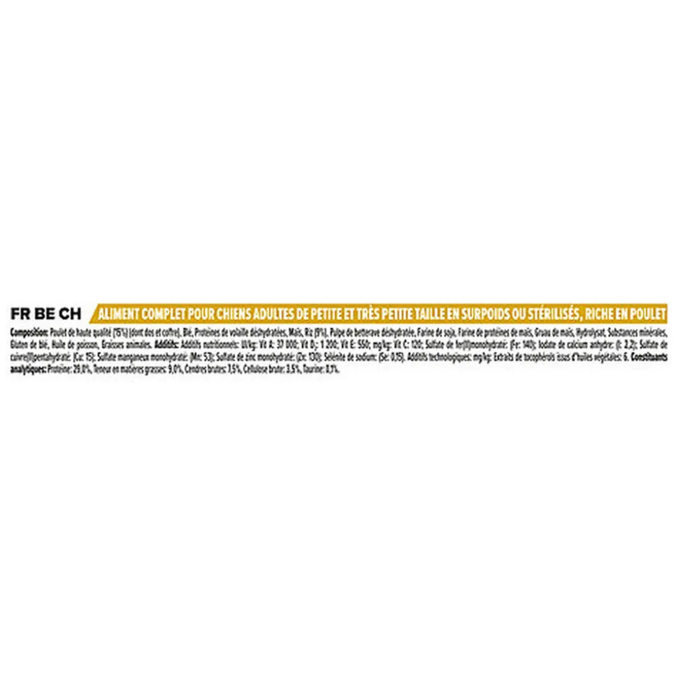 PURINA® PRO PLAN® Small & Mini adult avec OPTIWEIGHT® riche en Poulet est un aliment complet scientifiquement formulé pour les chiens adultes de petite taille en surpoids ou stérilisés.