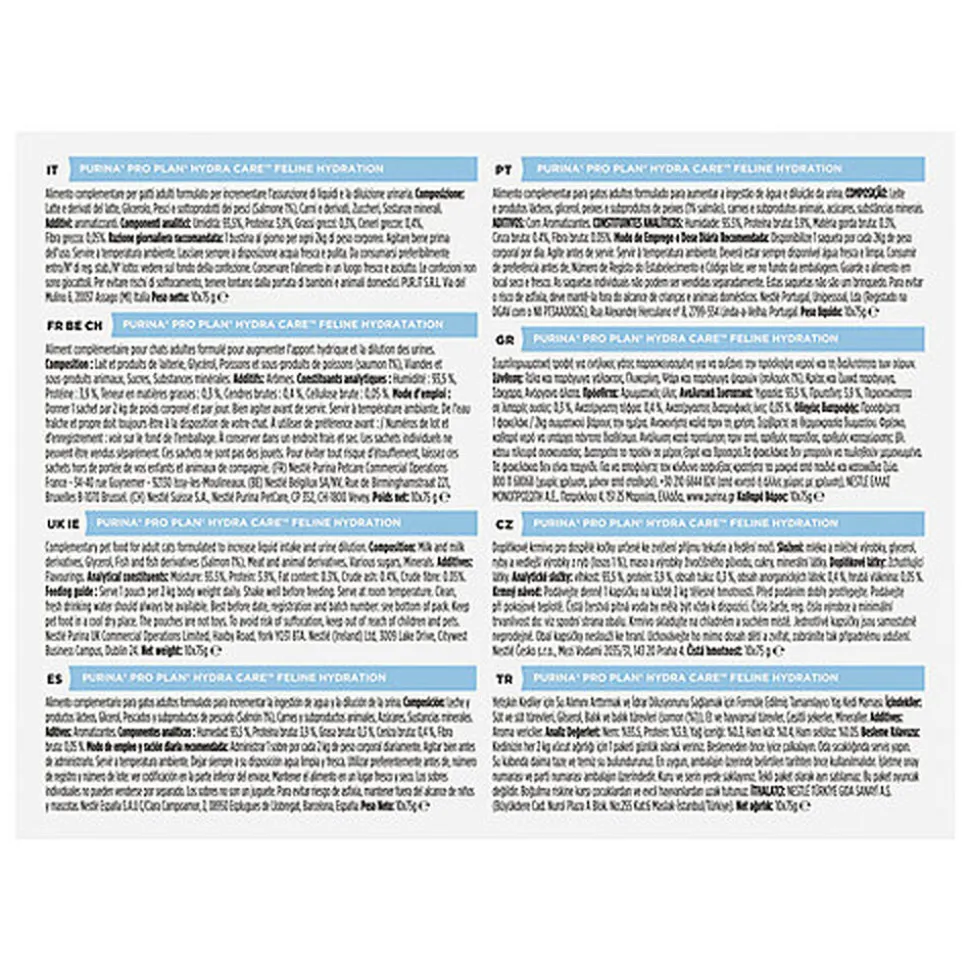 PURINA PRO PLAN Hydra CareTM est un complément alimentaire au goût délicieux et à la texture légère en gelée, à servir dans une 3ème gamelle. La grande saveur de la formule incitera les chats à laper avec plaisir Hydra CareTM, en augmentant leur apport hydrique total et en diminuant la densité et l’osmolalité spécifiques de l’urine.