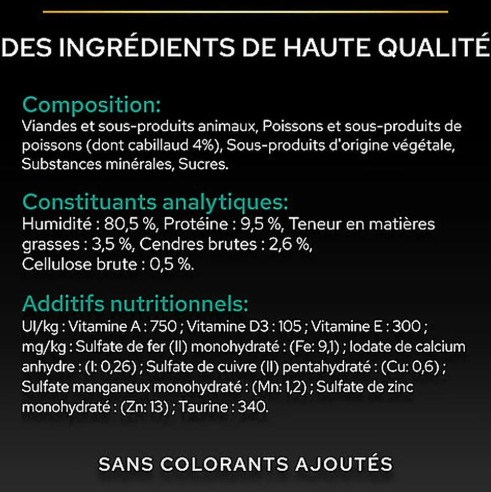 | Composition | Composition : Viandes et sous-produits animaux, Poissons et sous-produits de poissons (dont cabillaud 4%), Sous-produits d’origine végétale, Substances minérales, Sucres. |
