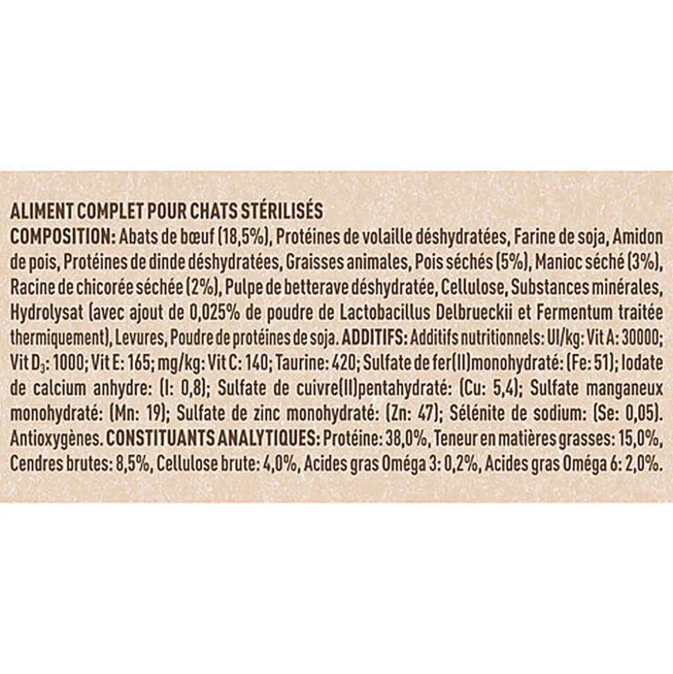 | Composition | Composition: Abats de bœuf (18,5%), Protéines de volaille déshydratées, Farine de soja, Amidon de pois, Protéines de dinde déshydratées, Graisses animales, Pois séchés (5%), Manioc séché (3%), Racine de chicorée séchée (2%), Pulpe de betterave déshydratée, Cellulose, Substances minérales, Hydrolysat (avec ajout de 0,025% de poudre de Lactobacillus Delbrueckii et Fermentum traitée thermiquement), Levures, Poudre de protéines de soja. |