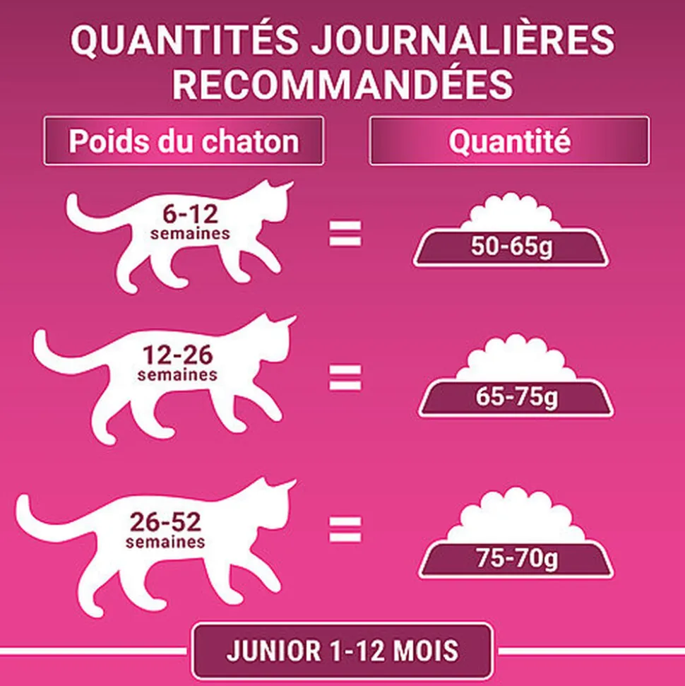 Contient une source naturelle de DHA, un nutriment fonctionnel aussi présent dans le lait maternel, reconnu pour stimuler le développement du cerveau et de la vue des chatons.Croissance saine de la masse musculaire et du squelette grâce à un niveau élevé en protéines et un taux équilibré en minéraux.Développement sain des fonctions vitales favorisé par un profil nutritionnel adapté aux chatons en croissance.Ingrédients de haute qualité favorisant la digestion.Nutriments essentiels et croustillant des croquettes qui contribuent à prendre soin des gencives et des dents des chatons.