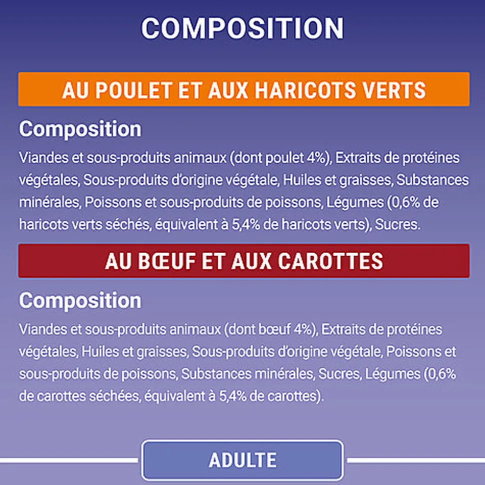| Composition | Composition: POULET : Viandes et sous-produits animaux (dont poulet 4%), Extraits de protéines végétales, Sous-produits d’origine végétale, Huiles et graisses, Substances minérales, Poissons et sous-produits de poissons, Légumes (0,6% de haricots verts séchés, équivalent à 5,4% de haricots verts), Sucres.BOEUF : Composition: Viandes et sous-produits animaux (dont bœuf 4%), Extraits de protéines végétales, Huiles et graisses, Sous-produits d’origine végétale, Poissons et sous-produits de poissons, Substances minérales, Sucres, Légumes (0,6% de carottes séchées, équivalent à 5,4% de carottes). |