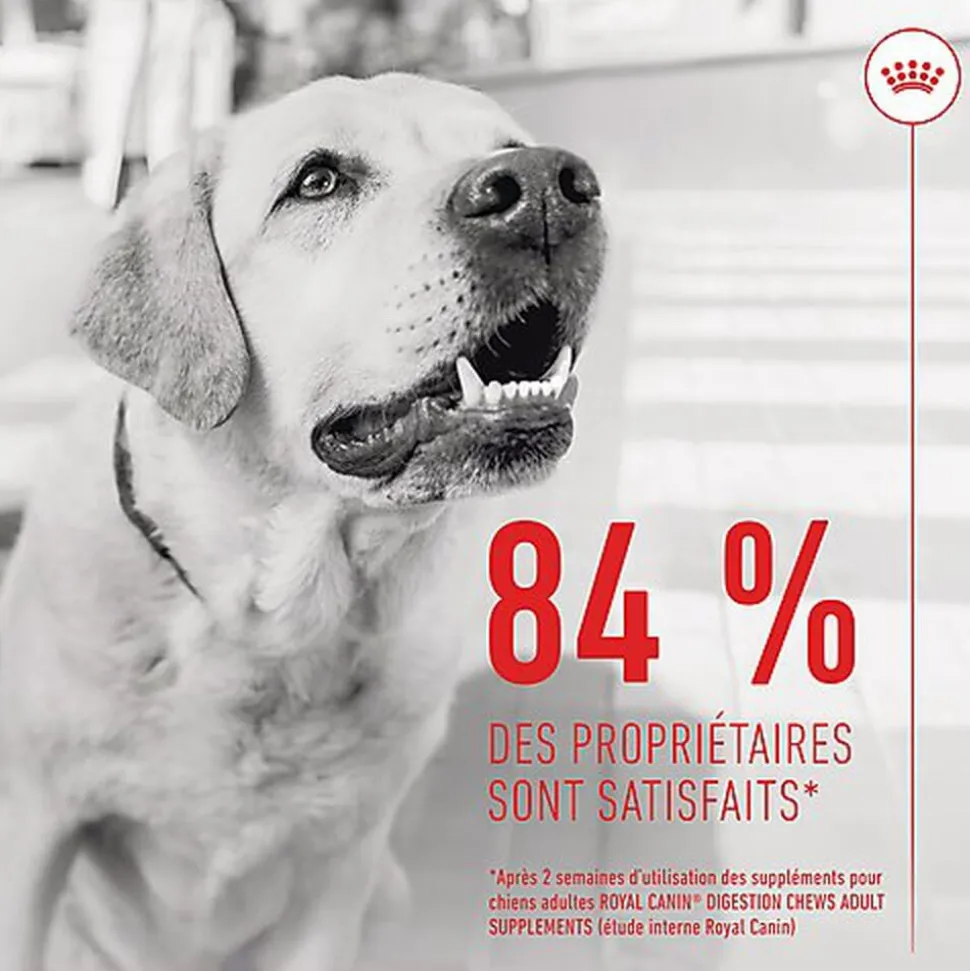 L’étude a démontré que 84 % des propriétaires étaient satisfaits des suppléments pour chiens adultes ROYAL CANIN® DIGESTION CHEWS ADULT SUPPLEMENTS après seulement 2 semaines d’utilisation.