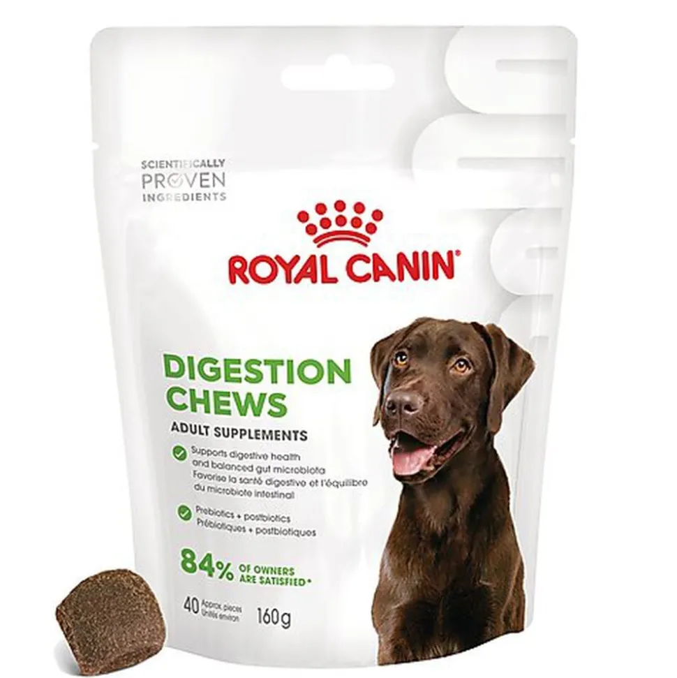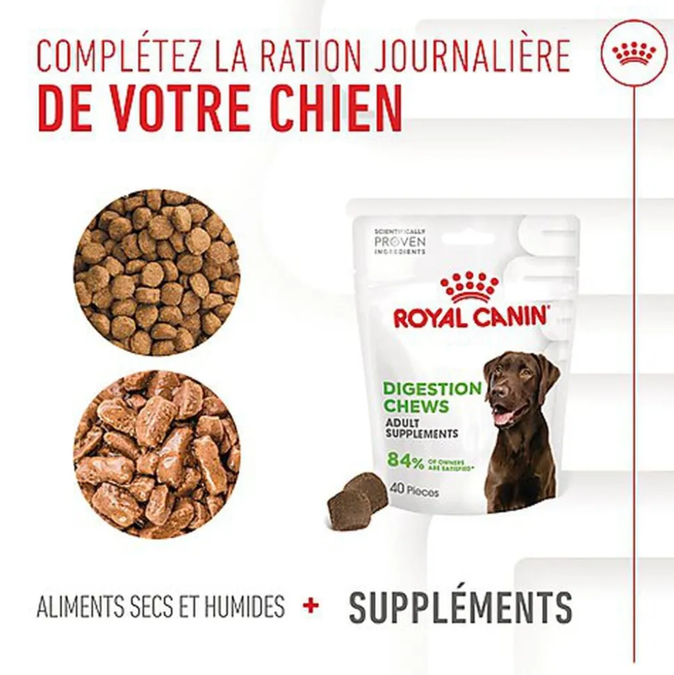 Convenant aux chiens adultes, les suppléments ROYAL CANIN® DIGESTION CHEWS ADULT SUPPLEMENTS sont conçus par des vétérinaires et approuvés par les chiens. Ces suppléments contiennent une combinaison scientifique d’ingrédients, appuyée par plus de 50 ans de recherche et d’observation dans le domaine de la nutrition canine.