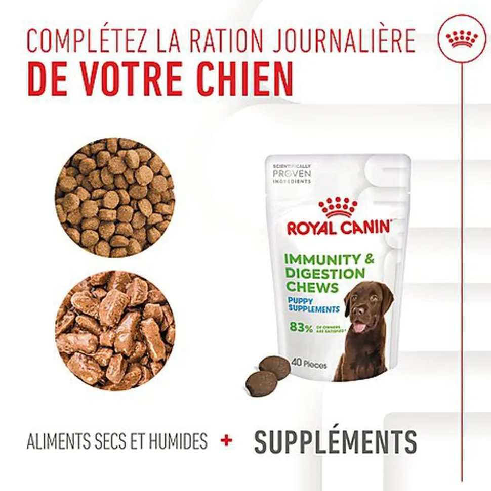 Les suppléments ROYAL CANIN® IMMUNITY & DIGESTION CHEWS PUPPY SUPPLEMENTS contiennent des vitamines C et E pour aider à soutenir les défenses naturelles et la santé cellulaire de votre chiot. Ils contiennent également des prébiotiques qui aident à maintenir un équilibre sain des bactéries intestinales, et des bêta-glucanes (postbiotiques) qui favorisent une digestion saine et la qualité des selles.