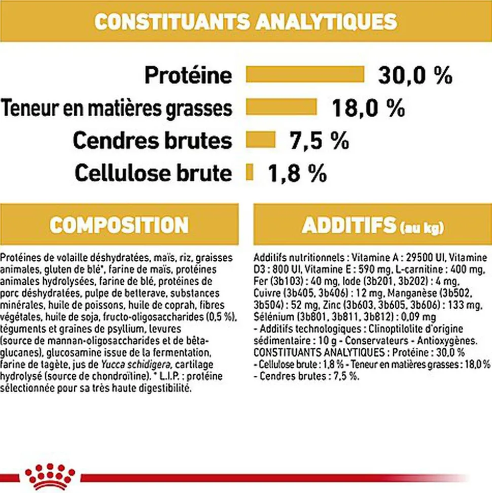 | Composition | Composition : Protéines de volaille déshydratées, maïs, riz, graisses animales, gluten de blé*, farine de maïs, protéines animales hydrolysées, farine de blé, protéines de porc déshydratées, pulpe de betterave, substances minérales, huile de poissons, huile de coprah, fibres végétales, huile de soja, fructo-oligosaccharides (0,5 %), téguments et graines de psyllium, levures (source de mannan-oligosaccharides et de bêta-glucanes), glucosamine issue de la fermentation, farine de tagète, jus de Yucca schidigera, cartilage hydrolysé (source de chondroïtine).*L.I.P. : protéine sélectionnée pour sa très haute digestibilité. |
