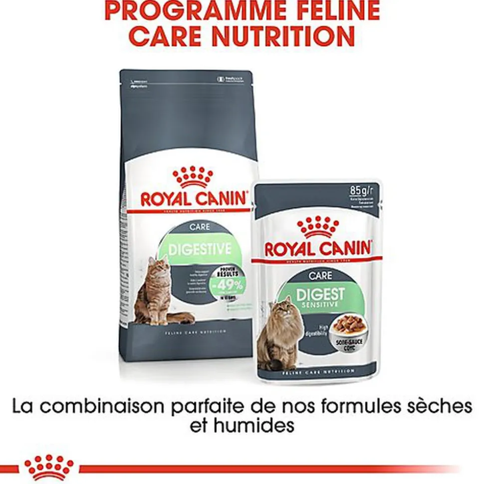 Pour répondre aux préférences individuelles de chaque chat, ROYAL CANIN® Digestive Care est également disponible sous forme de nourriture humide en émincé en sauce. Si vous envisagez une alimentation mixte, il vous suffit de suivre nos instructions pour vous assurer que votre chat reçoit la quantité de nourriture sèche et humide nécessaire pour un bénéfice optimal.