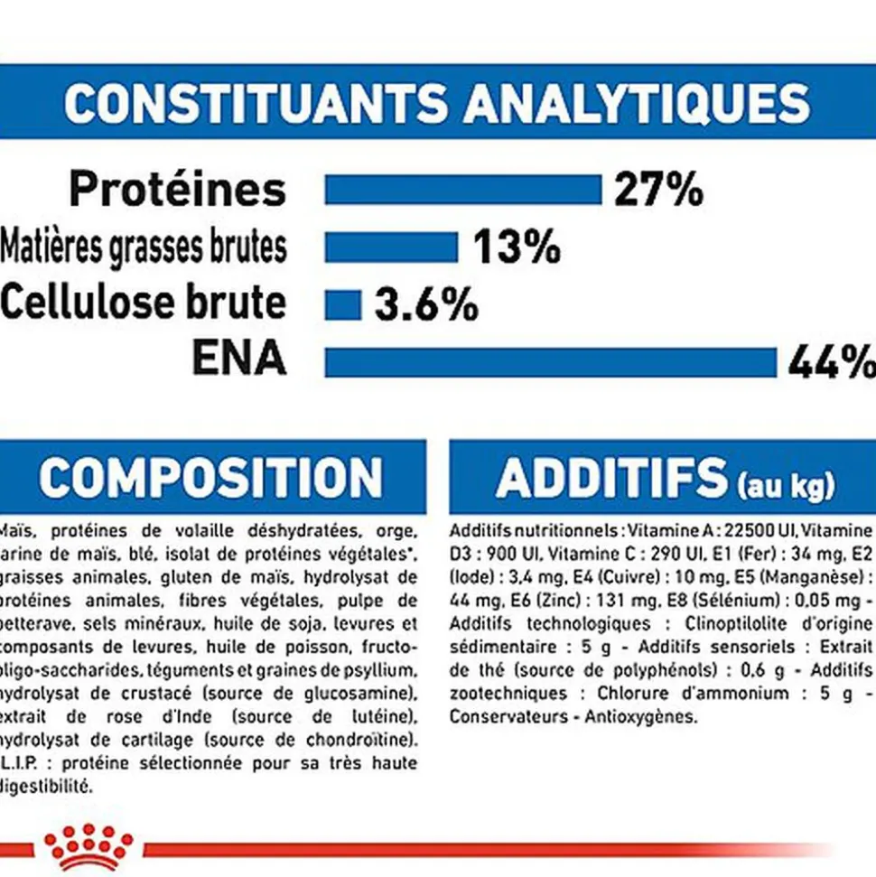 | Composition | COMPOSITION: dehydrated poultry protein, maize, maize flour, barley, wheat, vegetable protein isolate*, maize gluten, animal fats, hydrolysed animal proteins, beet pulp, minerals, vegetable fibres, soya oil, fish oil, yeasts, psyllium husks and seeds, fructo-oligo-saccharides, borage oil, green tea extracts (source of polyphenols), hydrolysed crustaceans (source of glucosamine), marigold extract (source of lutein), hydrolysed cartilage (source of chondroitin).ADDITIVES (per kg): Nutritional additives: Vitamin A: 27800 IU, Vitamin D3: 1100 IU, E1 (Iron): 43 mg, E2 (Iodine): 4.3 mg, E4 (Copper): 4 mg, E5 (Manganese): 56 mg, E6 (Zinc): 168 mg, E8 (Selenium): 0.07 mg – Preservatives – Antioxidants.ANALYTICAL CONSTITUENTS: Protein: 27% – Fat content: 13% – Crude ash: 6.3% – Crude fibres: 3.5% – Per kg: Essential fatty acids: 37 g – Phosphorus: 7.9 g.*L.I.P.: protein selected for its very high assimilation. |