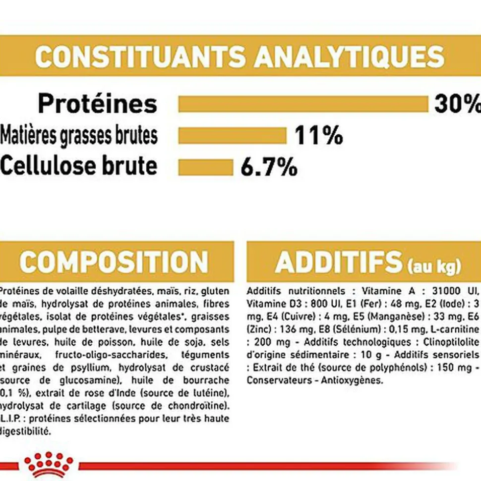 | Composition | COMPOSITIONProtéines de volaille déshydratées,maïs,riz, gluten de maïs,fibres végétales, hydrolysat de protéines animales, isolat de protéines végétales*, graisses animales, pulpe de betterave,levures, sels minéraux, huile de poisson,huile de soja, téguments et graines de psyllium,fructo-oligosaccharides,hydrolsat de crustacé(source de glucosamine), huile de bourrache (0,1 %), extraits de thé vert et de raisins (sources de polyphénols),extrait de rose d’Inde(source de lutéine), hydrolysat de cartilage (source de chondroïtine). – ADDITIFS (au kg)Additifs nutritionnels : Vitamine A:23370 UI, Vitamine D3 : 800 UI,E1(Fer):38 mg, E2 (Iode) : 2,6 mg,E4(Cuivre) : 2 mg, E5 (Manganèse): 50 mg,E6 (Zinc) : 190 mg,E8(Sélénium):0,1mg, L-carnitine : 200 mg – Conservateurs – Antioxygènes.*L.I.P.: Protéines sélectionnées pour leur très haute digestibilité.CONSTITUANTS ANALYTYQUES: Protéines: 30% – Matières grasses: 11% – Cellulose brute: 6.6% – Cendres brutes: 6.6% – Acides gras dont EPA et DHA : 4.1 g/kg. |
