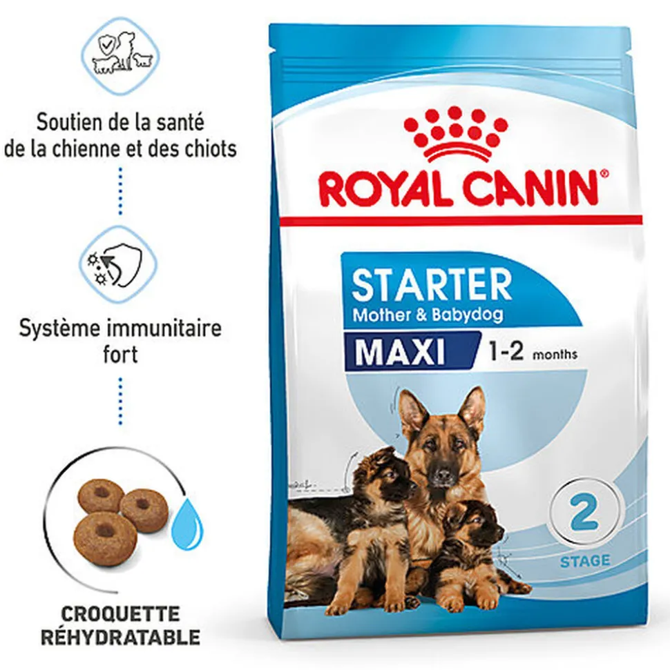 Les croquettes ROYAL CANIN® Maxi Starter Mother & Babydog sont formulées pour répondre aux besoins nutritionnels des chiennes et de leurs chiots. Cette formule convient aux chiennes adultes de grandes races pesant entre 26 et 44 kg et aux chiots au sevrage jusqu’à l’âge de 2 mois.