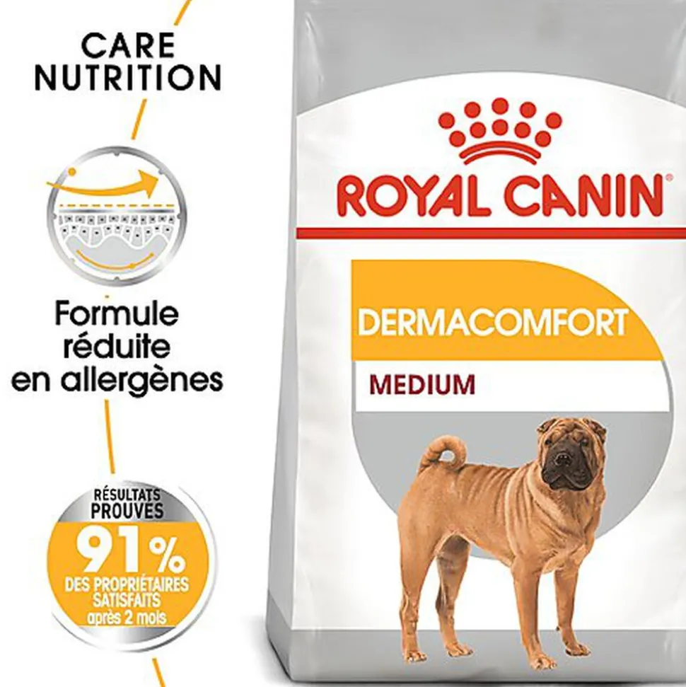 La formule spécifique MEDIUM DERMACOMFORT contient des sources de protéines sélectionnées de très haute qualité et convient particulièrement aux chiens sujets aux irritations et démangeaisons de peau. Au bout d’un mois, 87 %* des propriétaires constatent que leur chien se gratte moins.