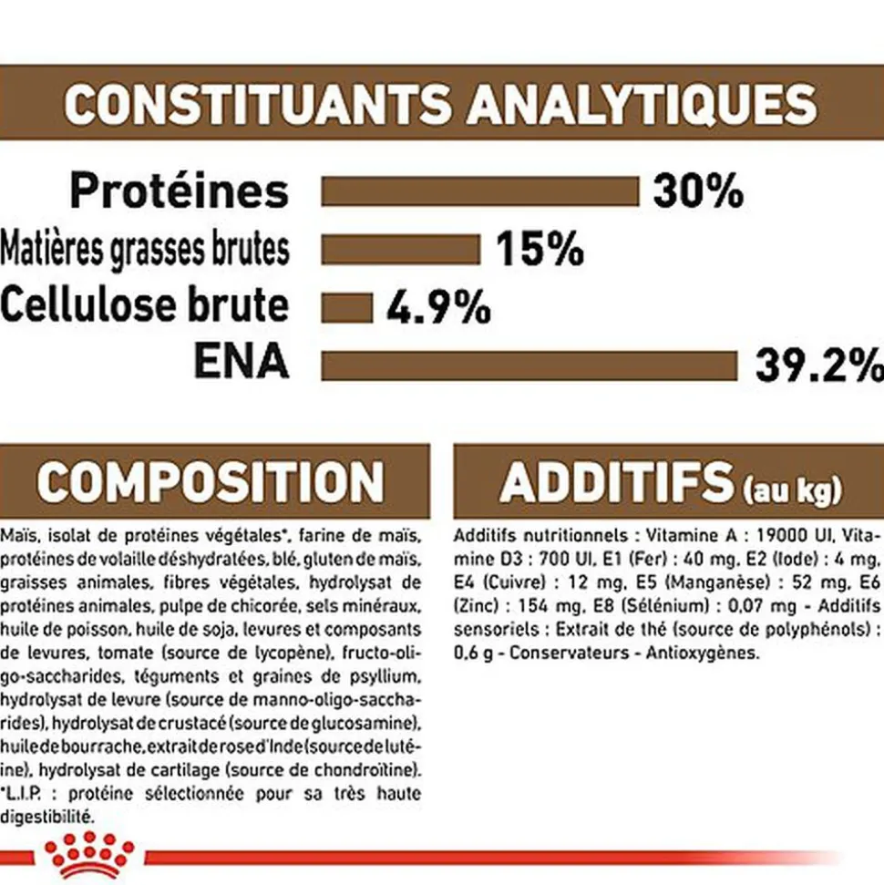 | Composition | COMPOSITION: maïs, isolat de protéines végétales*, farine de maïs, protéines de volaille déshydratées, gluten de maïs, blé, graisses animales, fibres végétales, hydrolysat de protéines animales, pulpe de chicorée, sels minéraux, huile de soja, huile de poisson, tomate (source de lycopène), téguments et graines de psyllium, fructo-oligo-saccharides, hydrolysat de levure (source de manno-oligo-saccharides), hydrolysat de crustacé (source de glucosamine), huile de bourrache, extraits de thé vert et de raisins (sources de polyphénols), extrait de rose d’inde (source de lutéine), hydrolysat de cartilage (source de chondroïtine). – ADDITIFS (au kg): Additifs nutritionnels : Vitamine A : 19500 UI, Vitamine D3 : 700 UI, E1 (Fer) : 47 mg, E2 (Iode) : 4,7 mg, E4 (Cuivre) : 9 mg, E5 (Manganèse) : 61 mg, E6 (Zinc) : 183 mg, E8 (Sélénium) : 0,09 mg – Conservateurs – Antioxygènes. – CONSTITUANTS ANALYTIQUES: Protéine : 30 % – Matières grasses brutes : 15 % – Cendres brutes : 5,5 % – Fibres alimentaires brutes : 5 % – Au kg : Phosphore : 6 g – Polyphénols de thé vert et de raisins : 150 mg – Lycopène : 10 mg – Acides gras essentiels : 46,7 g.*L.I.P. : protéine sélectionnée pour sa très haute assimilation. |
