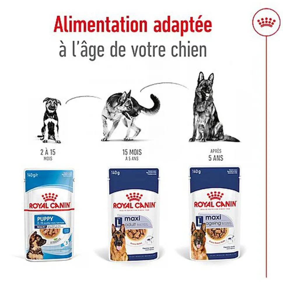 Adapté à tous les chiens de grande race âgés de plus de 8 ans et pesant entre 26 et 44 kg, ROYAL CANIN® Maxi Ageing 8+ en sauce est spécialement formulé pour répondre à tous les besoins nutritionnels de votre grand chien mature. ROYAL CANIN® Maxi Ageing 8+ en sauce a été conçu pour aider à soutenir un vieillissement sain des chiens de grande race comme le vôtre. Sa formule enrichie d’un complexe exclusif d’antioxydants aide à neutraliser les radicaux libres, tandis que des acides gras oméga-3 EPA et DHA contribuent à soutenir les os et les articulations de votre chien à mesure qu’il vieillit.