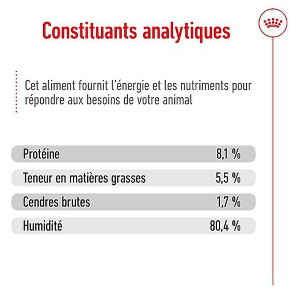 | Constituants analytiques | CONSTITUANTS ANALYTIQUES : Constituants analytiques : Protéine : 8,0 % – Teneur en matières grasses : 5,5 % – Cendres brutes : 1,5 % – Cellulose brute : 0,9 % – Humidité : 80,0 % – Phosphore : 0,16 % – EPA & DHA : 0,12 %. |
