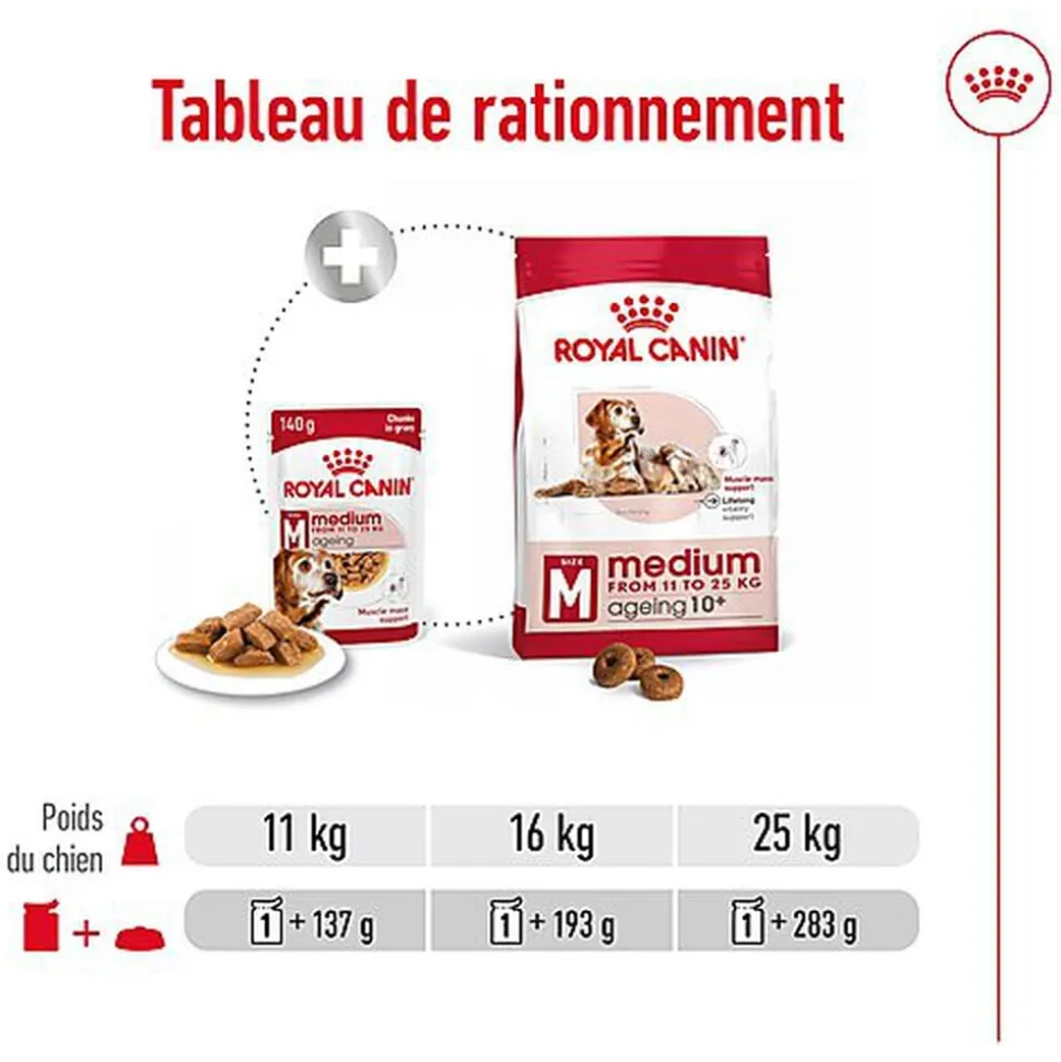 Afin de satisfaire les préférences alimentaires de chaque chien, ROYAL CANIN® Medium Ageing 10+ est également disponible sous forme de savoureuses croquettes. Si vous envisagez une alimentation mixte, consultez le tableau de rationnement sur l’emballage pour vous assurer que vous lui donnez la quantité exacte d’aliments secs et humides pour un bien-être optimal.