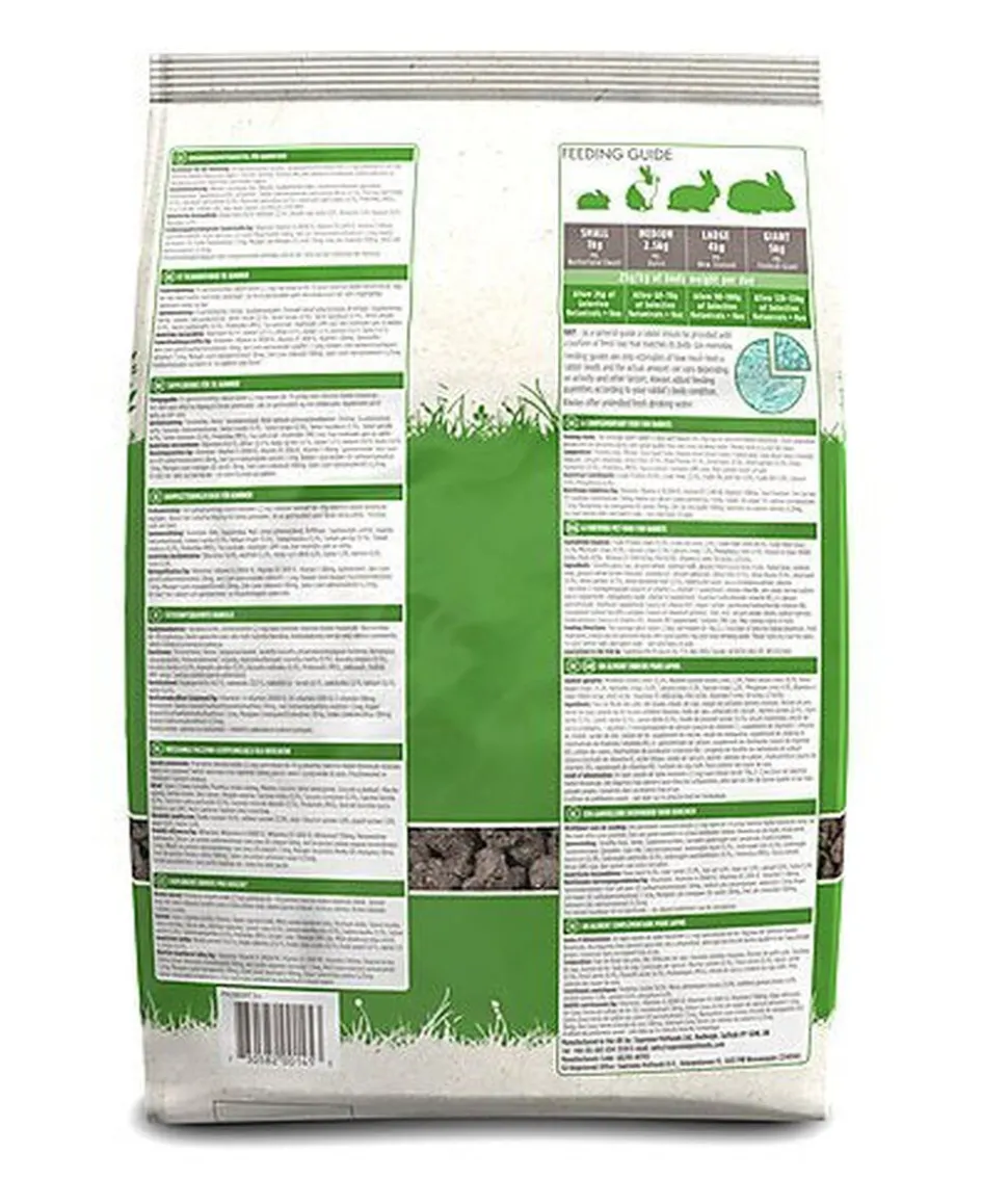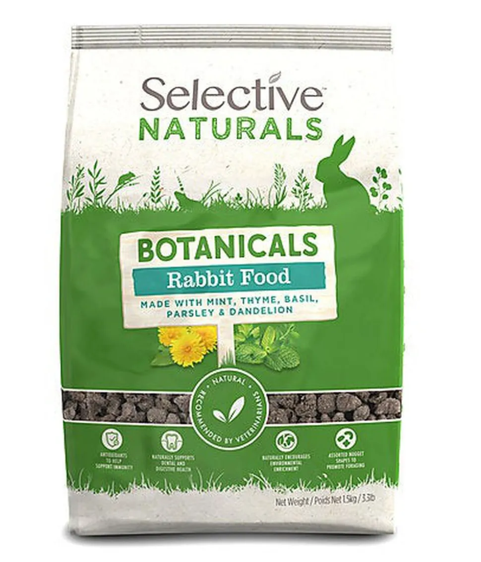 Un lapin adulte de taille moyenne (2,5Kg) aura besoin de 60 à 70g par jour de granulés Selective Rabbit Botanicals. Des légumes frais doivent également être mis à disposition de l’animal ainsi que du foin de qualité et de l’eau potable propre.