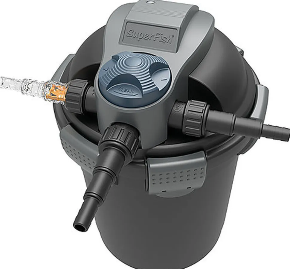 Filtre à pression pour bassin, pratique avec 3 types de filtration, fourni avec une pompe pour bassin. Montage pratique, tous les raccordements se trouvant sur le couvercle, le filtre peut être presque entièrement enterré ou dissimulé à côté du bassin, même s’il est possible de le placer sous le niveau de l’eau.