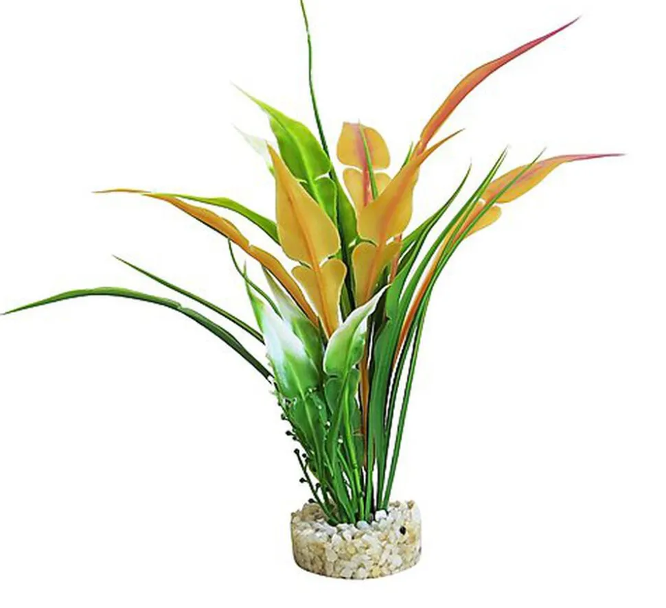 Composition de plantes artificielles sur base en gravier naturel pour aquarium, sert de cachette anti stress pour vos poissons. Sublime votre aquarium, design original.