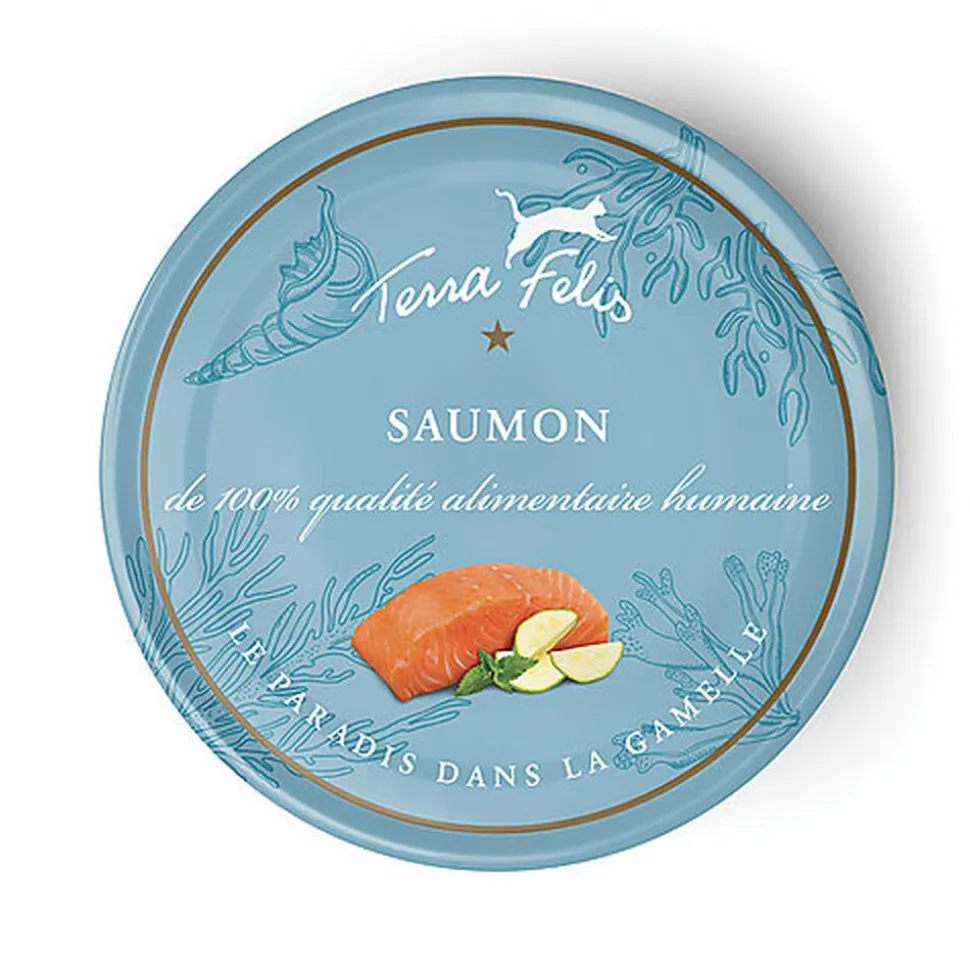 | Composition | Saumon »filet de saumon (89%), courgette (4%), tomate en poudre, algue marine*, herbe-aux-chats*, minéraux » |