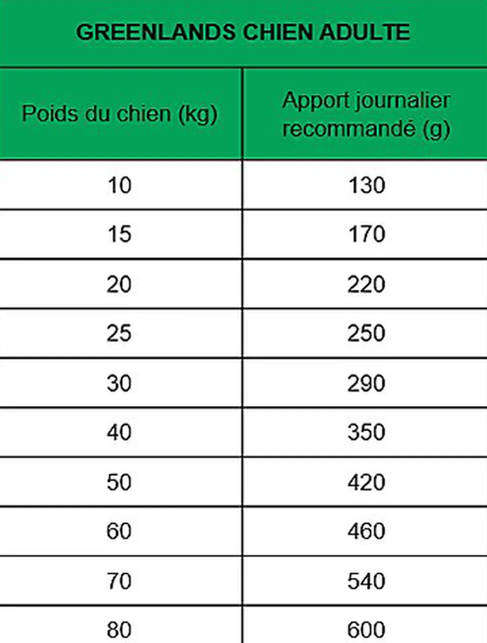 | Directives d’alimentation | La dose journalière recommandée est indiquée dans le tableau d’alimentation. Les besoins nutritionnels de votre chien peuvent varier en fonction de son âge, de son activité ou de son environnement. Servir sec ou légèrement humidifié avec de l’eau tiède ou du bouillon. Veillez à ce que votre chien ait toujours de l’eau fraîche à disposition. Eviter la suralimentation. |