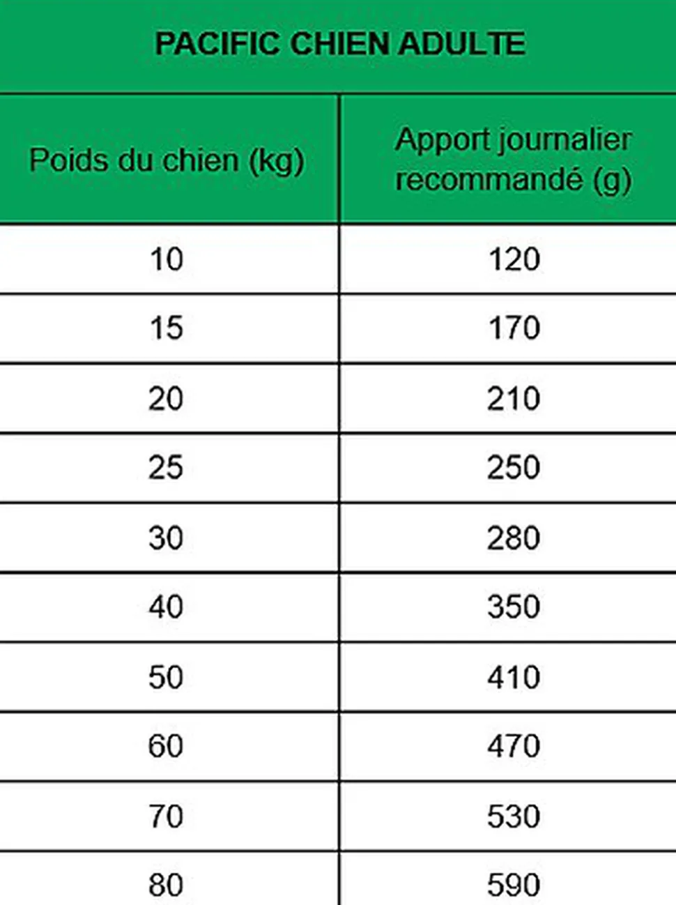 | Directives d’alimentation | La dose journalière recommandée est indiquée dans le tableau d’alimentation. Les besoins nutritionnels de votre chien peuvent varier en fonction de son âge, de son activité ou de son environnement. Servir sec ou légèrement humidifié avec de l’eau tiède ou du bouillon. Veillez à ce que votre chien ait toujours de l’eau fraîche à disposition. Eviter la suralimentation. |