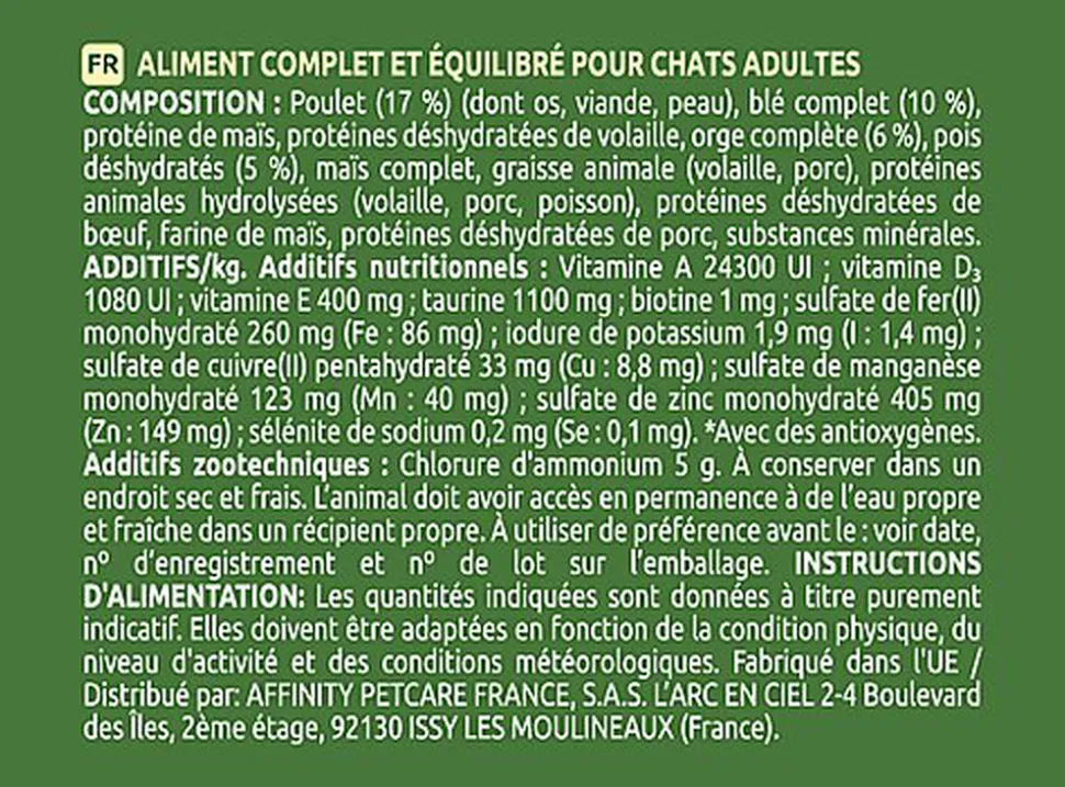 | Composition | Poulet (17 %) (dont os, viande, peau), blé complet (10 %), protéine de maïs, protéines déshydratées de volaille, orge complète (6 %), pois déshydratés (5 %), maïs complet, graisse animale (volaille, porc), protéines animales hydrolysées (volaille, porc, POISSON), protéines déshydratées de bœuf, farine de maïs, protéines déshydratées de porc, substances minérales. |