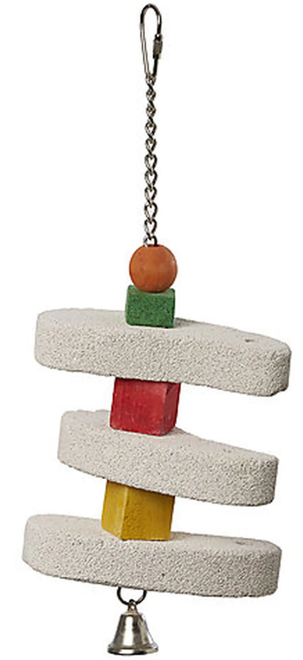 Jouet à suspendre avec grandes pierres à ronger et jouets en bois. La pierre ponce est un élément abrasif qui lime et limite la croissance continue du bec des Psittacidés !