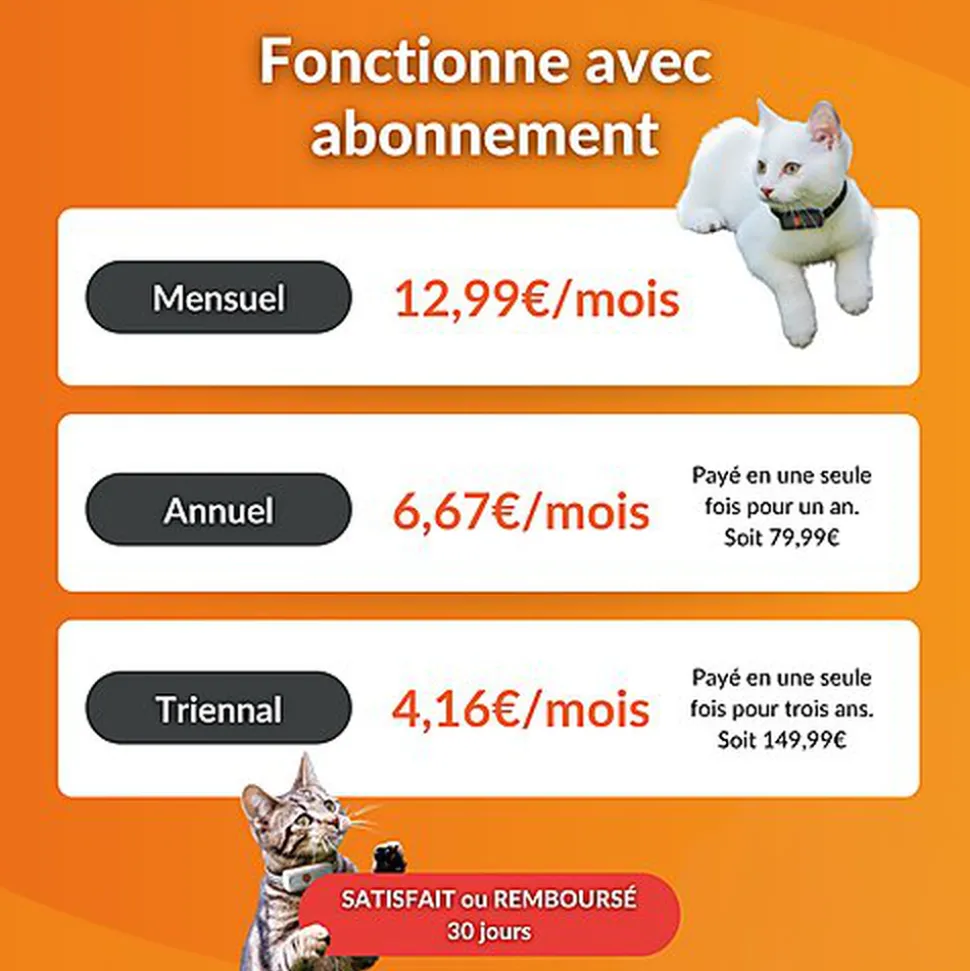 | Abonnement requis | Le traceur GPS est équipé d’une carte SIM (fournie). Il nécessite un abonnement pour couvrir les frais de service. Abonnements dès 4,16€/mois : mensuel (min. 3 mois), 1 an, 3 ans. |