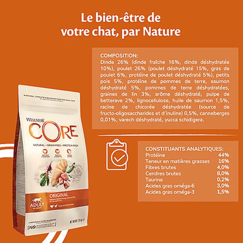 Les croquettes Wellness CORE Original Dinde et Poulet sont complètes et équilibrées pour les chats adultes.