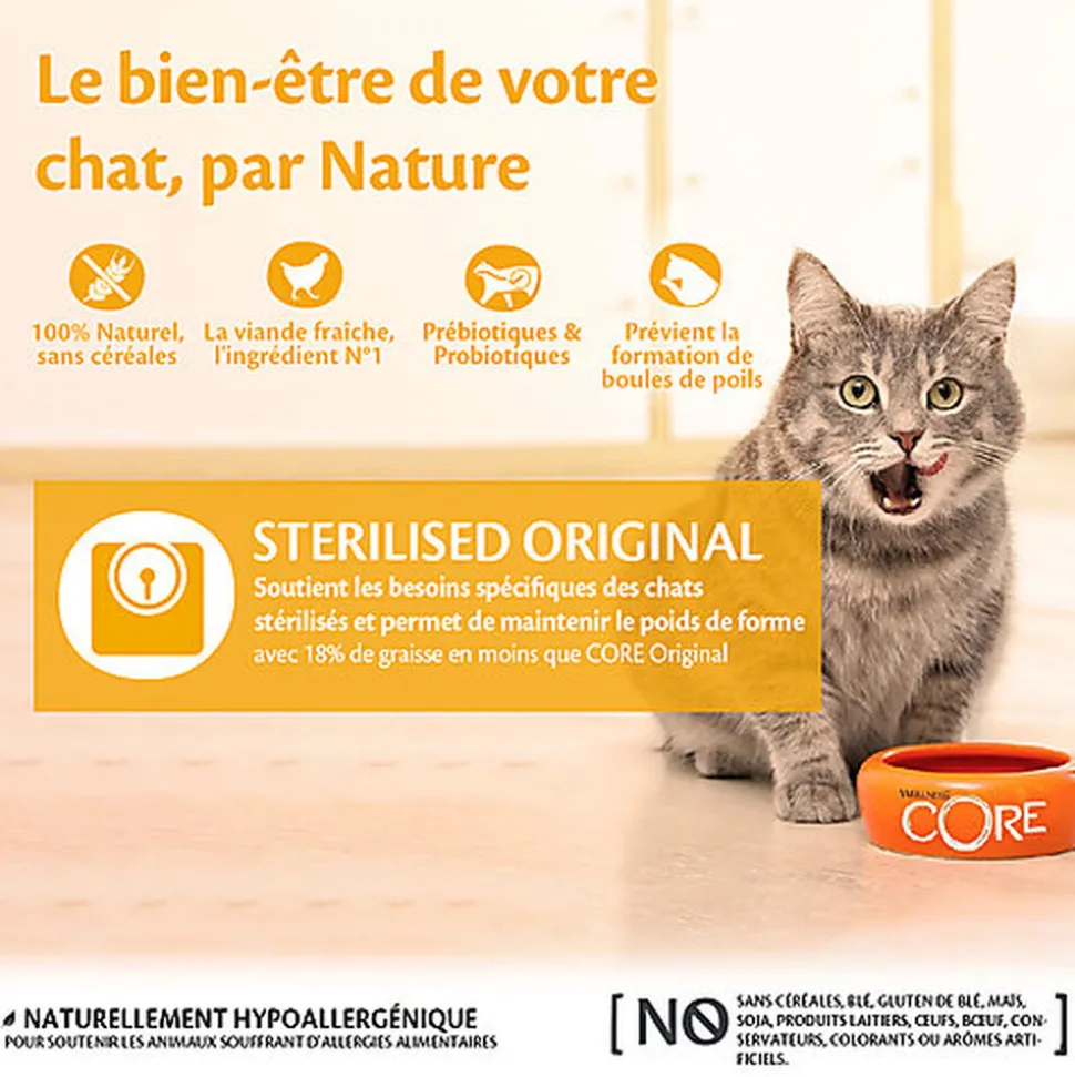 Notre recette Wellness CORE Sterilised Original est formulée de sorte à soutenir les besoins spécifiques des chats stérilisés & le maintient du poids de forme avec 18% de matières grasses en moins que la recette CORE Original.