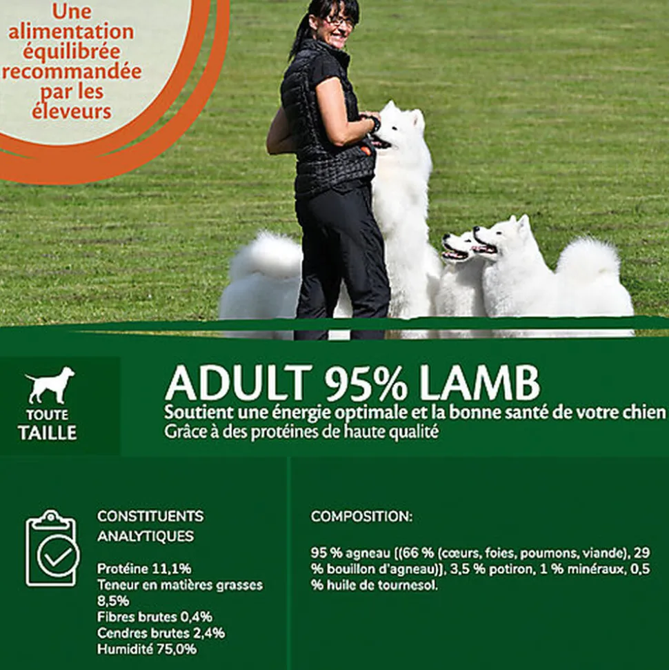 | Composition | Agneau 95% (66% (cœur, foie, poumons, viande), 29% bouillon d’agneau), potiron 4%, minéraux 1% |