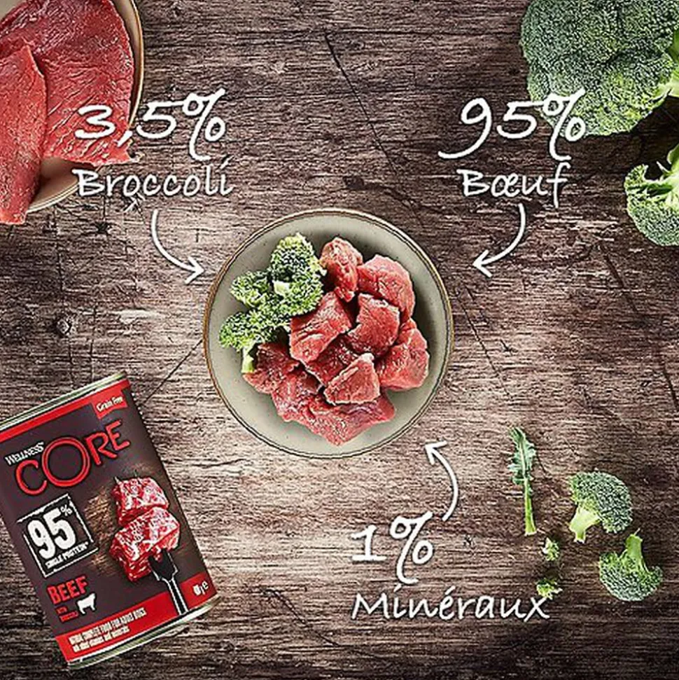 | Composition | Bœuf 95% (66% (cœur, viande, foie, poumons), 29% bouillon de bœuf), brocoli 4%, minéraux 1% |