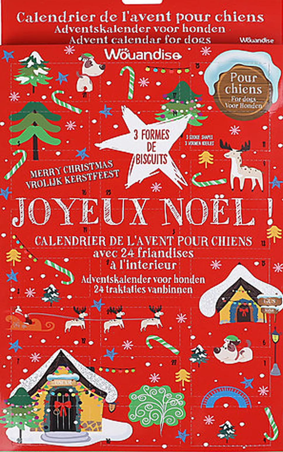 Calendrier de l’Avent pour chiens avec 3 sortes de biscuits différentes à l’intérieur. 24 friandises à découvrir petit à petit en ouvrant une case par jour du 1er au 24 décembre.