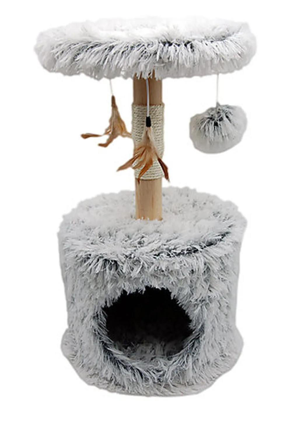Arbre à chat 4 en 1 moderne et cocooning avec notre tissu tout doux. – Espace cachette cocooning (diamètre 30 cm),- Plateau supérieur pour répondre au besoin des chats de se positionner en hauteur,- 3 jouets suspendus sur des ficelles élastiques pour stimuler votre chat,- Poteau avec sisal pour se faire les griffes.Un coloris bi-couleur qui s’intégrera avec élégance dans votre intérieur.